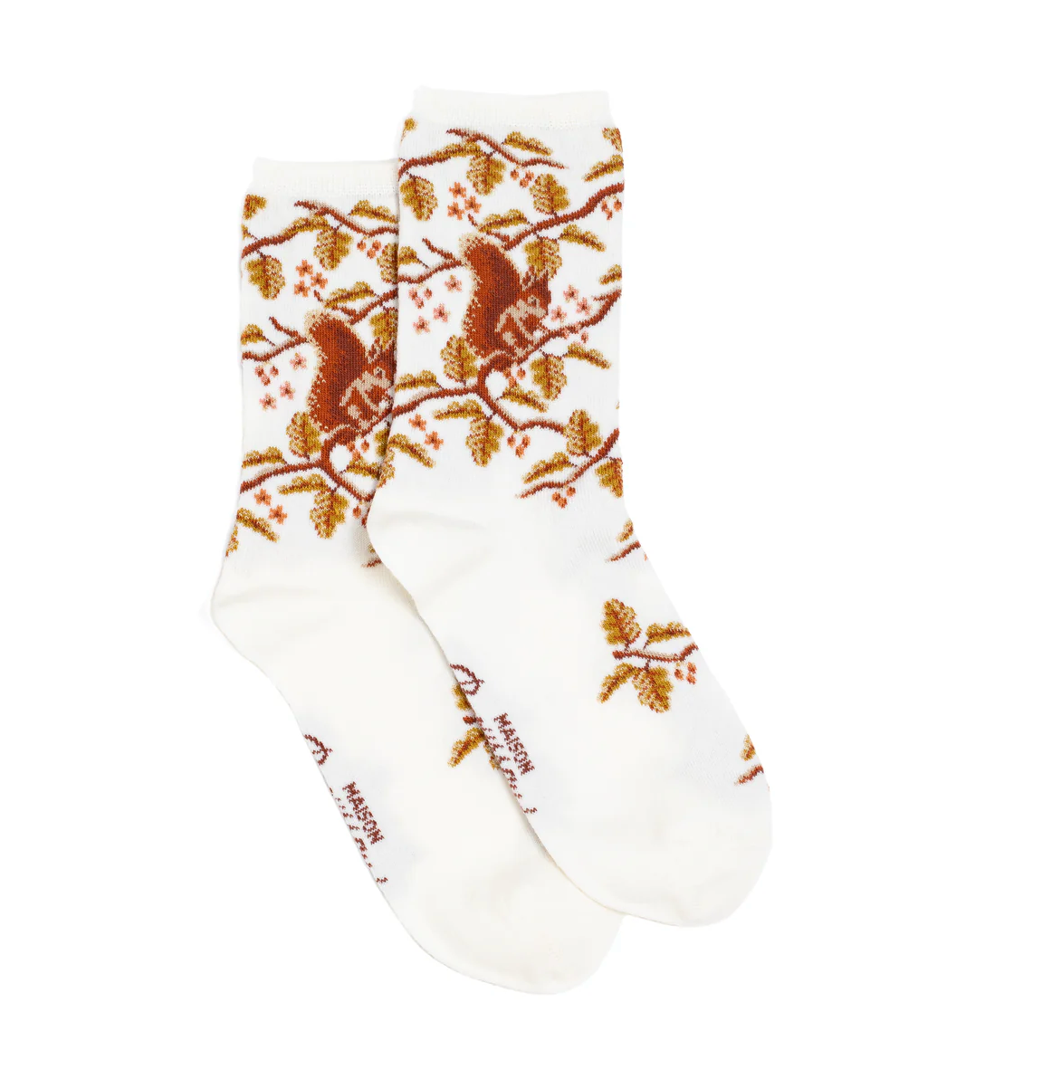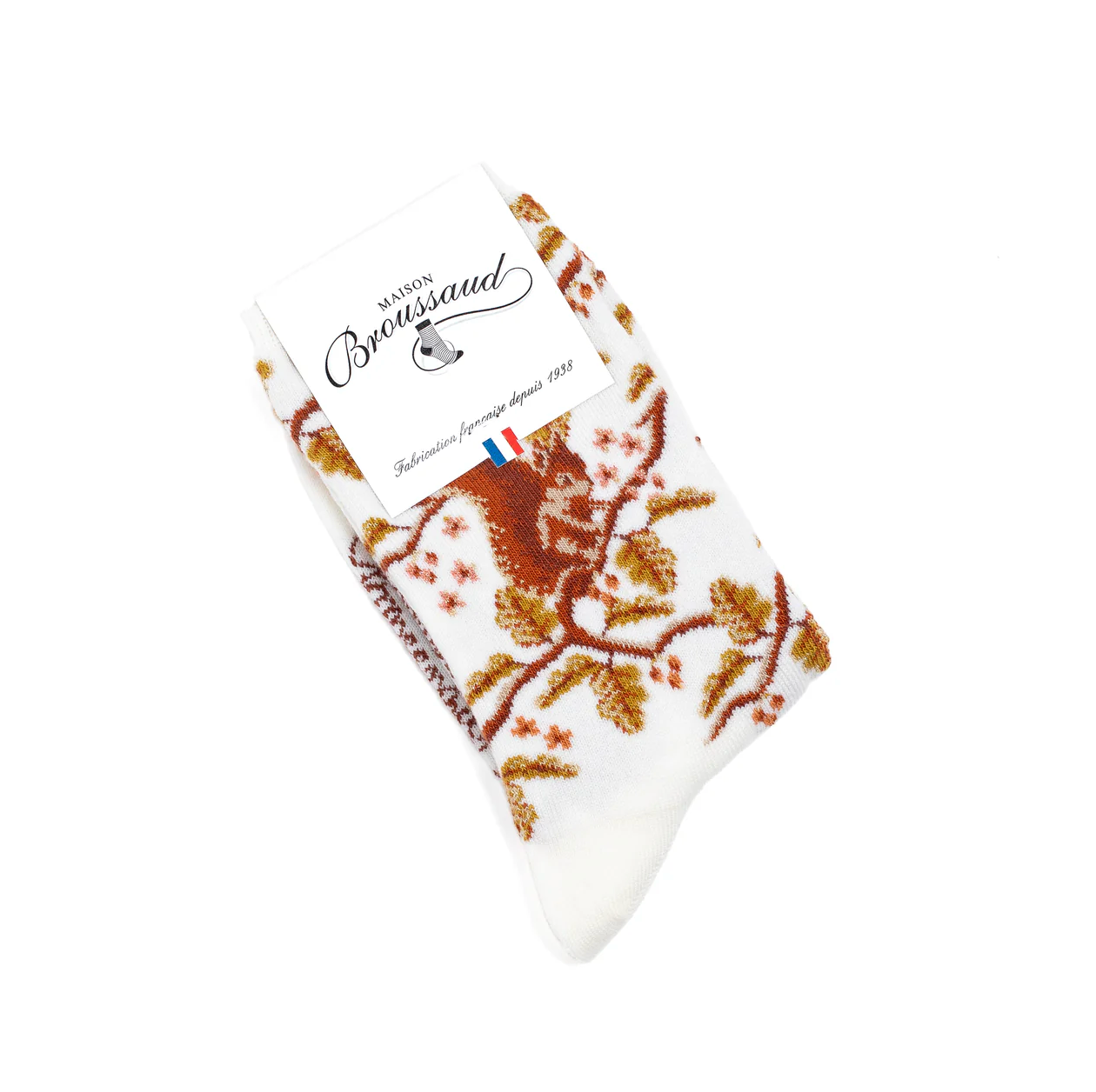 Douces, chaudes et pleines de poésie, les chaussettes Les Écureuils de Maison Broussaud sont un véritable cocon pour vos pieds. Tricotées en laine écru dans nos ateliers des Cars, elles allient chaleur, respirabilité et confort.