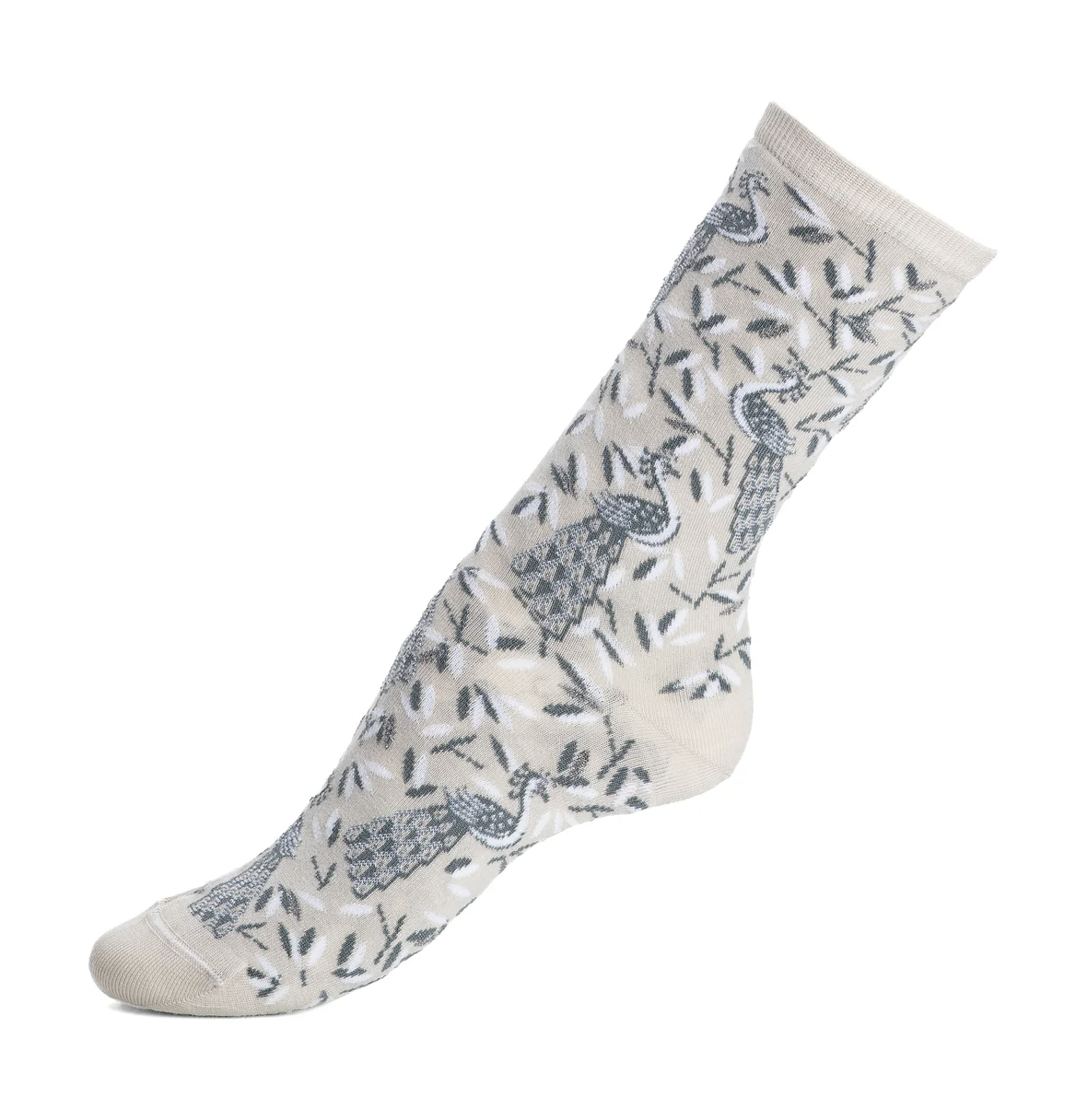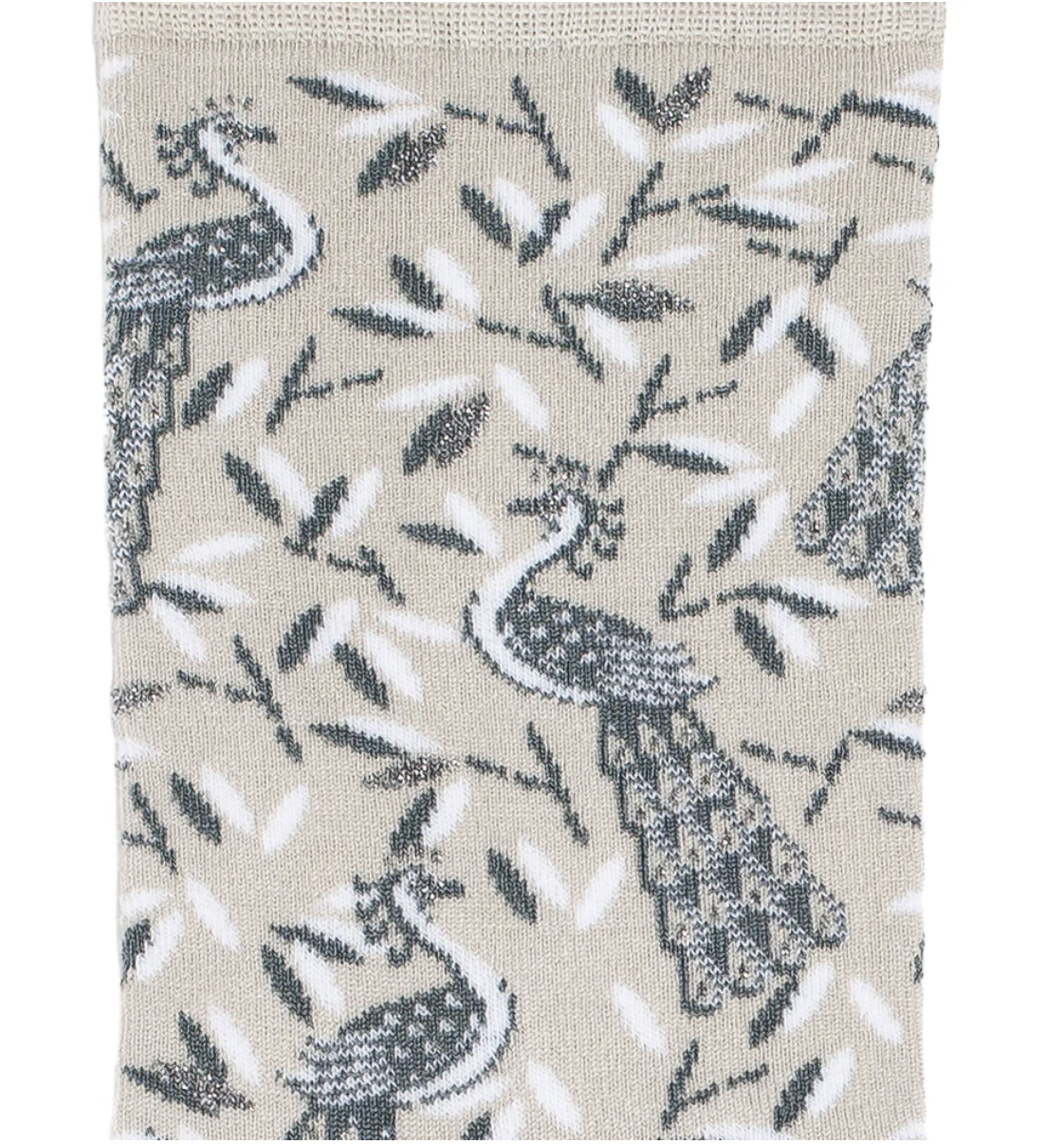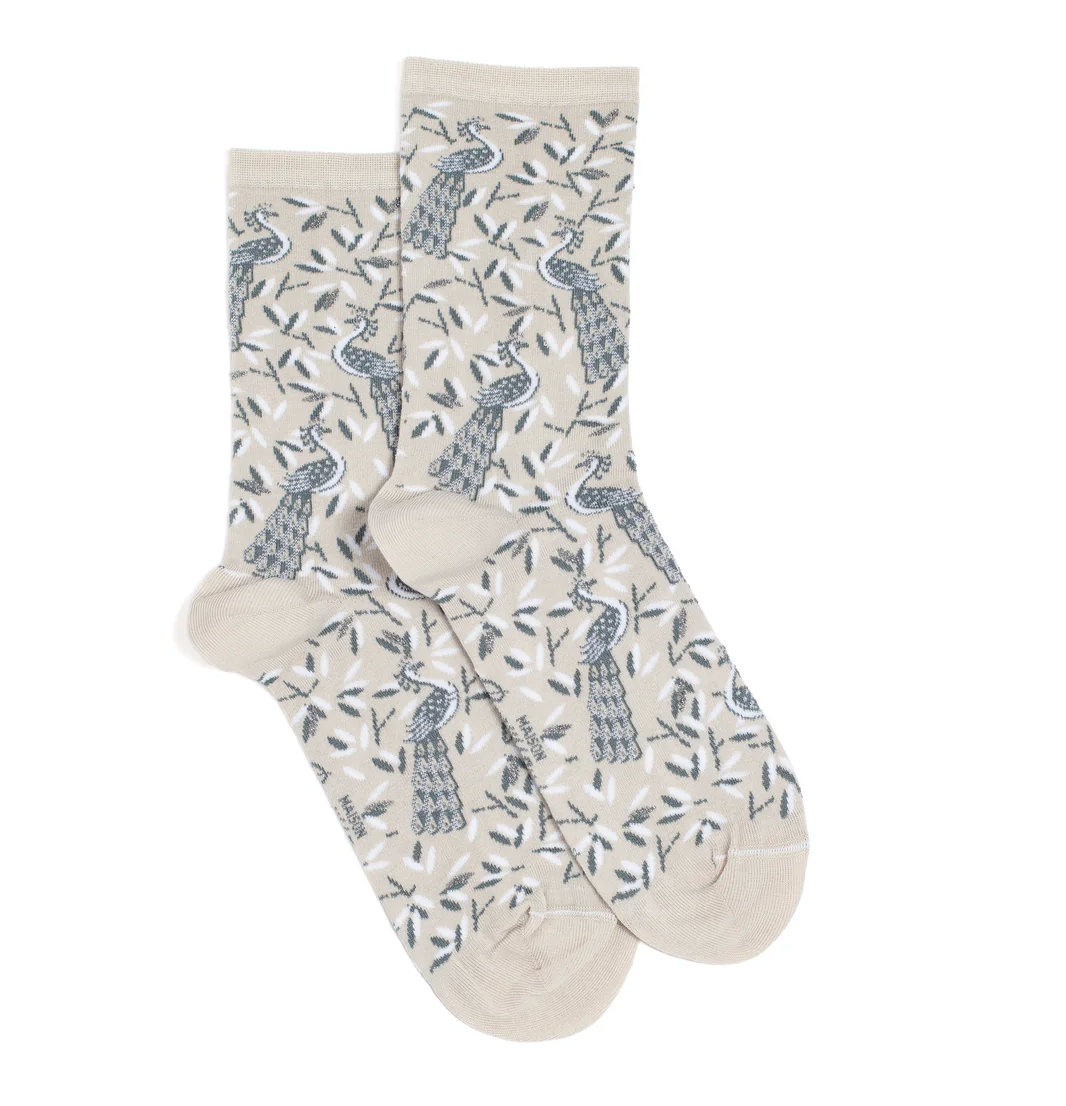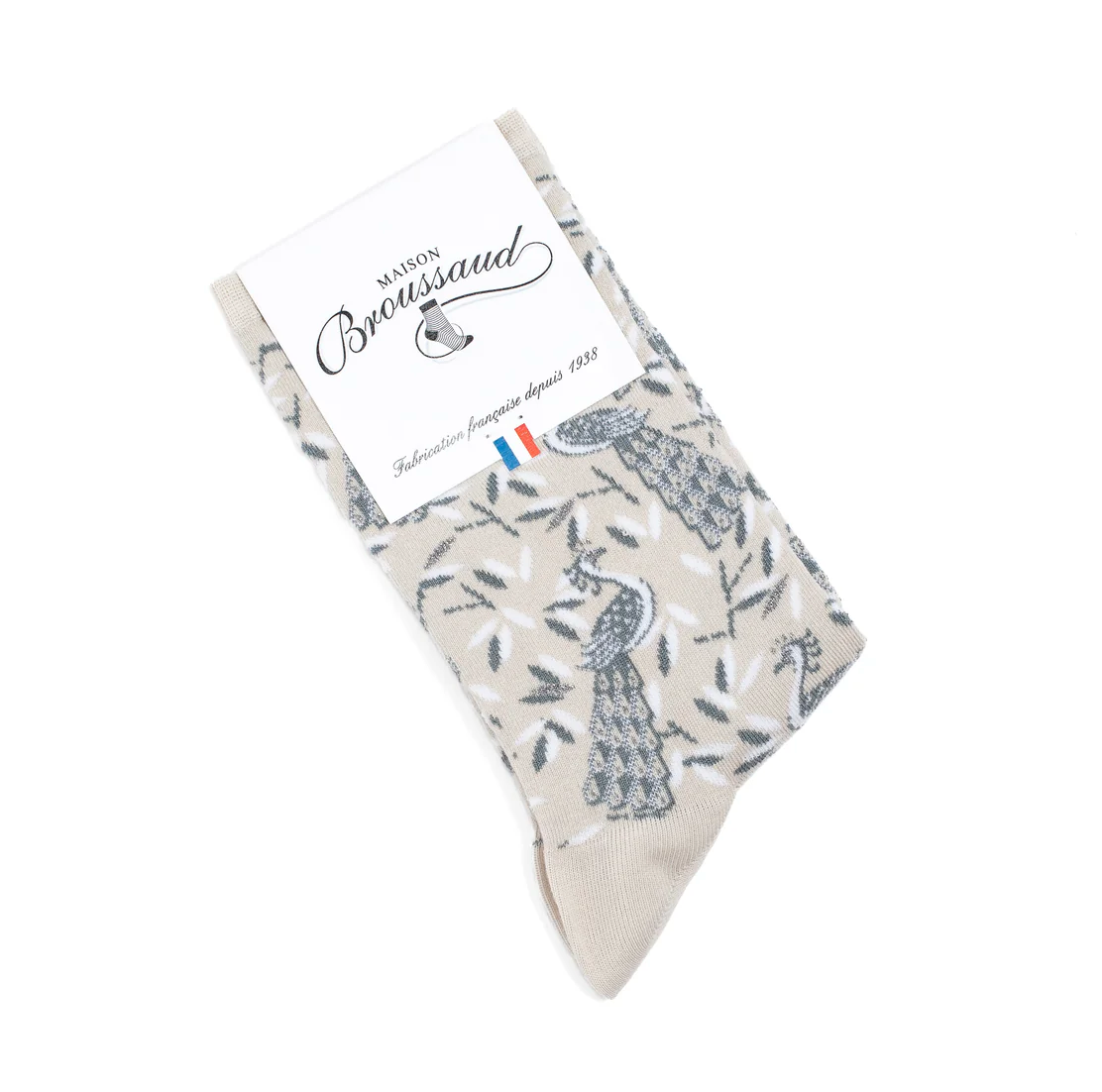 Exprimez toute votre élégance avec les chaussettes femme Junon de la Maison Broussaud. Tricotées sur un fond gris clair lumineux, elles dévoilent de magnifiques paons bleus entourés d’un délicat feuillage. Un motif raffiné et poétique qui habille vos pieds d’originalité et de grâce.