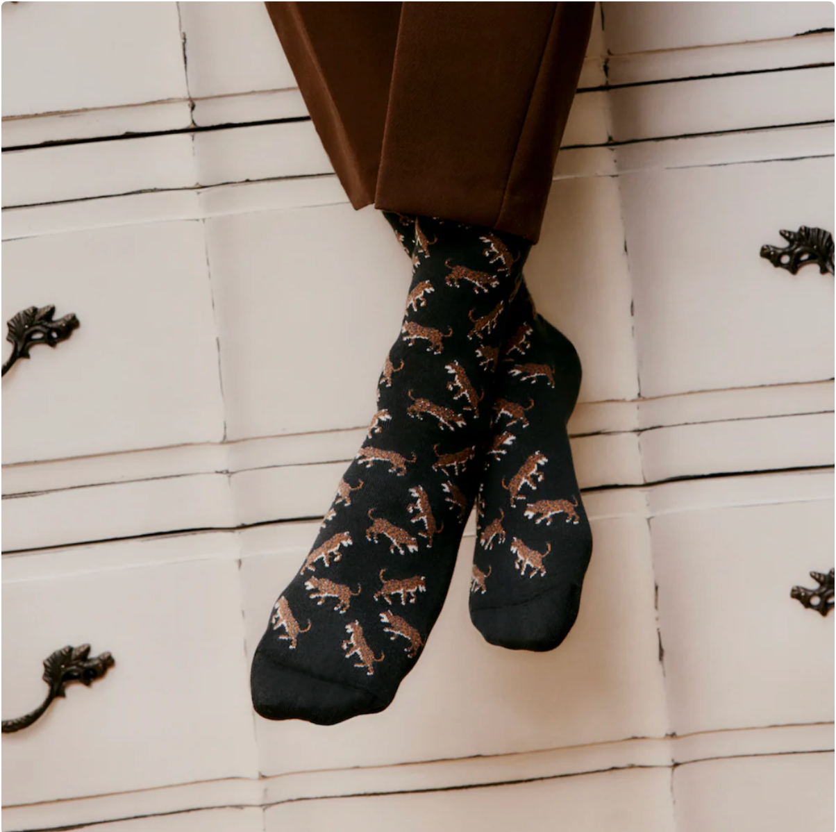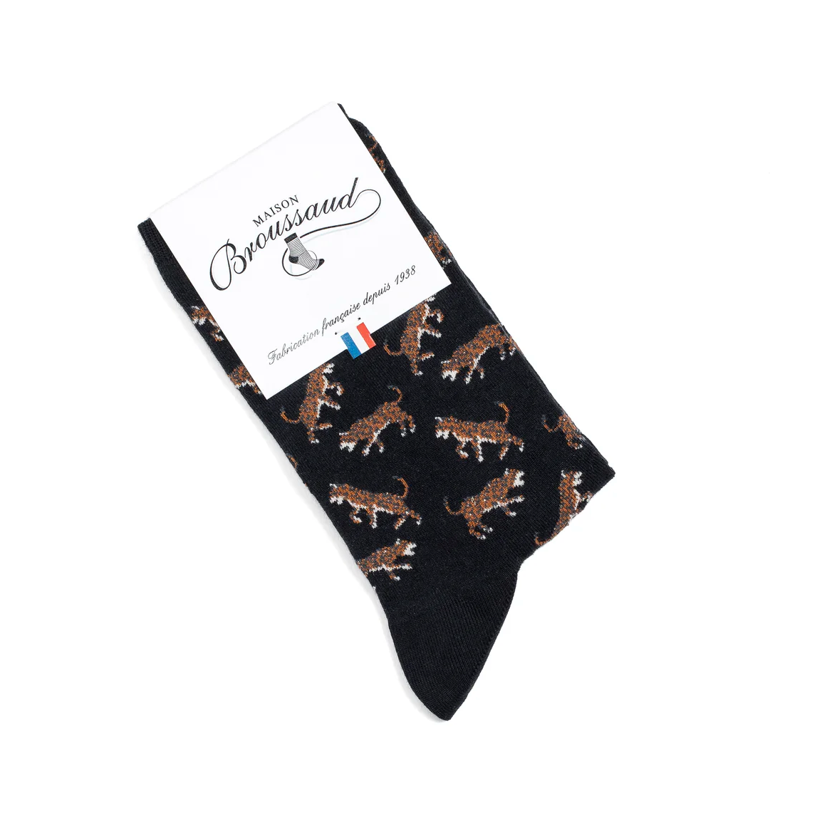 Affirmez votre style avec les chaussettes Les Léopards signées Maison Broussaud. Sauvages et élégantes, elles se distinguent par leurs léopards brodés en all-over, subtilement rehaussés de reflets métallisés. Un mélange parfait d’audace et de raffinement.