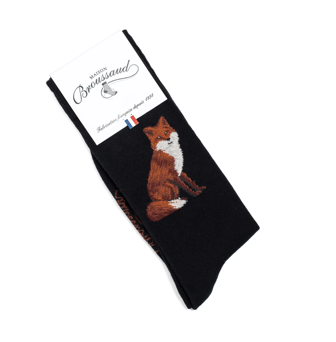 Alliez élégance et originalité avec les chaussettes Renard de la Maison Broussaud. Sur un fond noir raffiné, un renard finement tricoté trône sur la cheville et apporte une touche malicieuse à vos tenues.