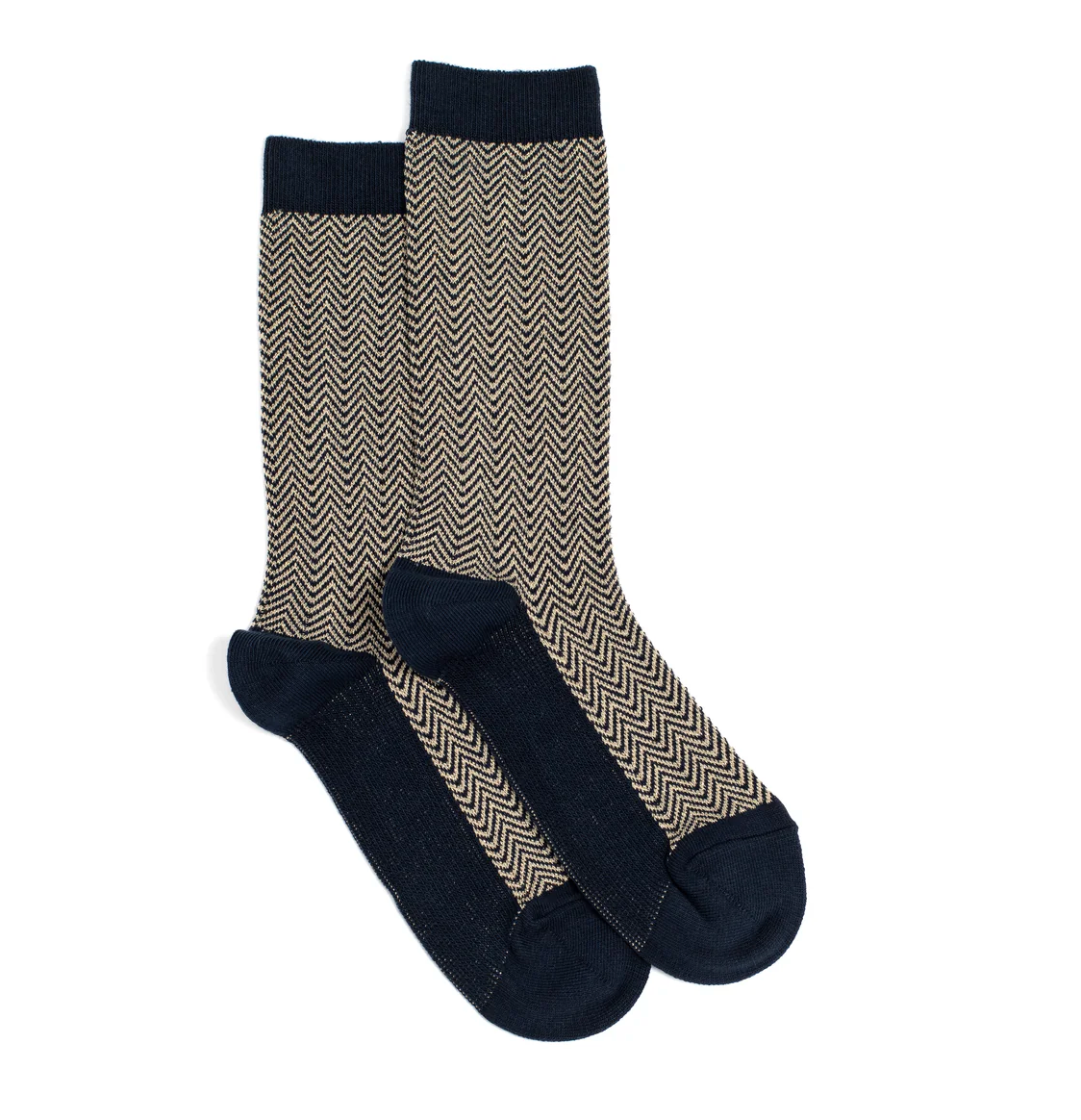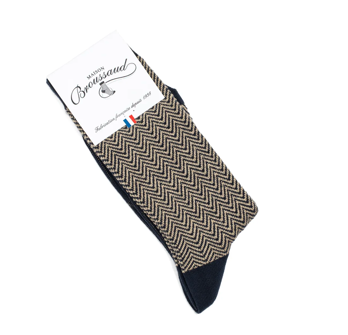 Affirmez votre style avec les chaussettes Les Chevrons de la Maison Broussaud. Leur motif graphique marine et beige apporte une touche chic et moderne, idéale pour donner du dynamisme à toutes vos tenues. Élégantes et raffinées, elles incarnent le savoir-faire français allié à une pointe de fantaisie.