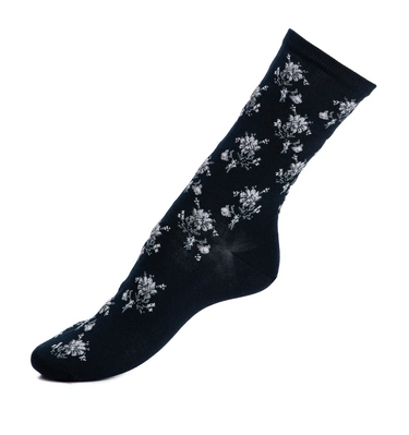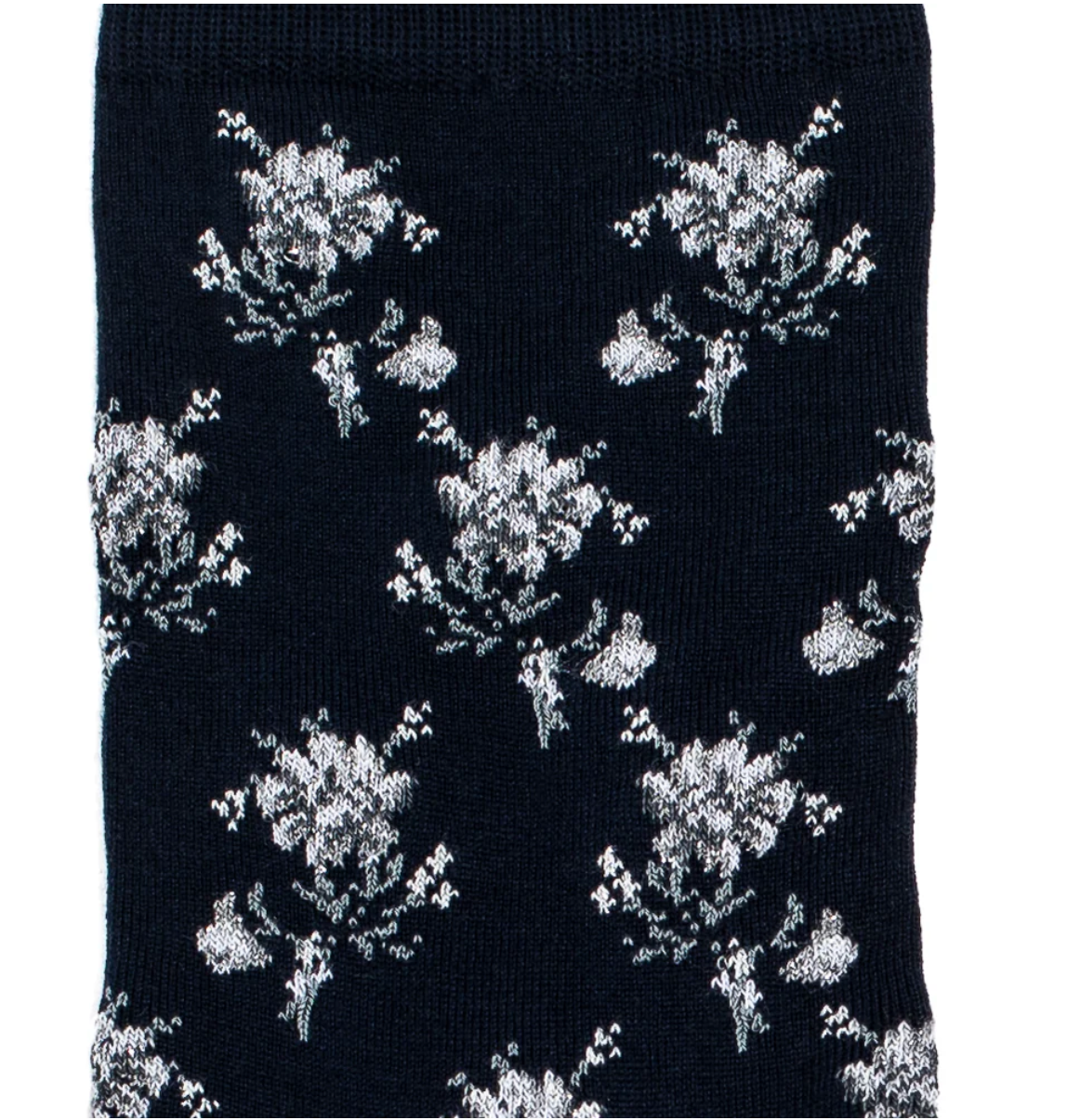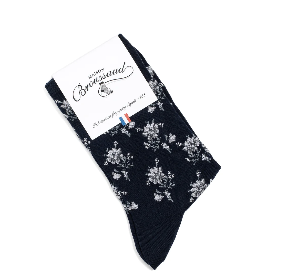 Succombez au charme intemporel des chaussettes Les Fleurs de la Maison Broussaud. Tricotées dans un coton doux de couleur bleu marine, elles se distinguent par leur motif floral raffiné, discret mais élégant, qui sublime toutes vos tenues.