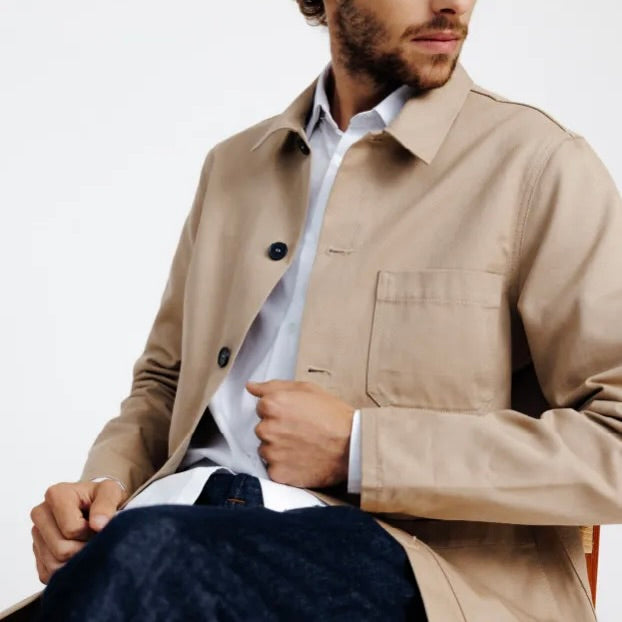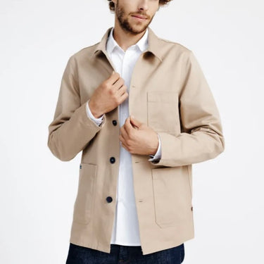 Une pièce intemporelle pour homme : la veste de travail beige, source d'inspiration classique. Cette veste est bien plus qu'un simple vêtement, elle incarne un engagement en faveur de l'environnement et de la durabilité. Fabriquée à partir de coton biologique, elle témoigne du souci de La Gentle Factory pour des matériaux respectueux de la planète.