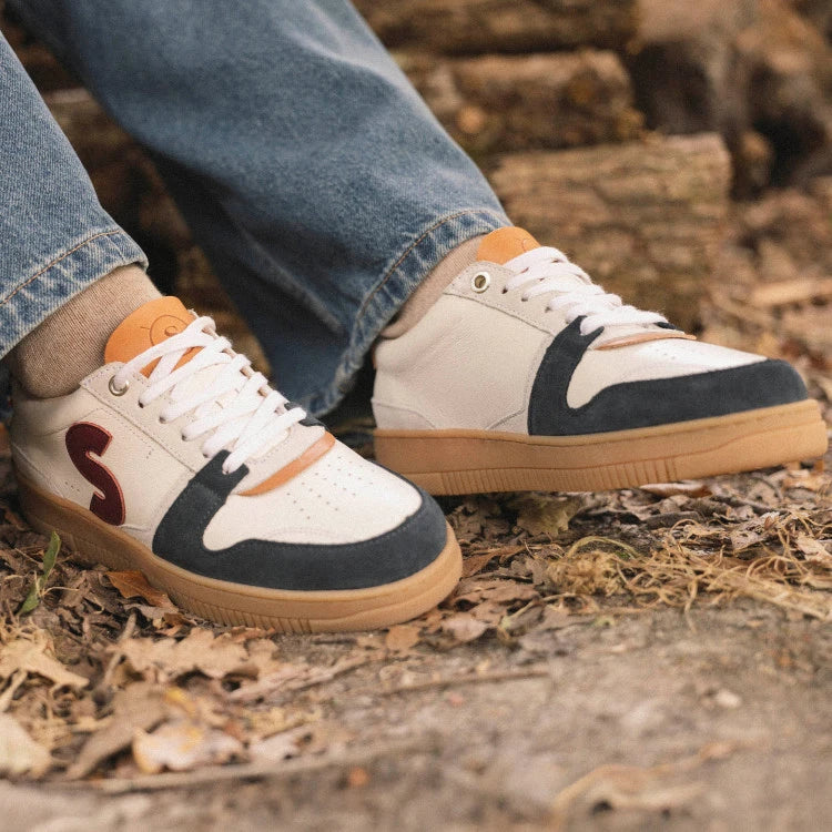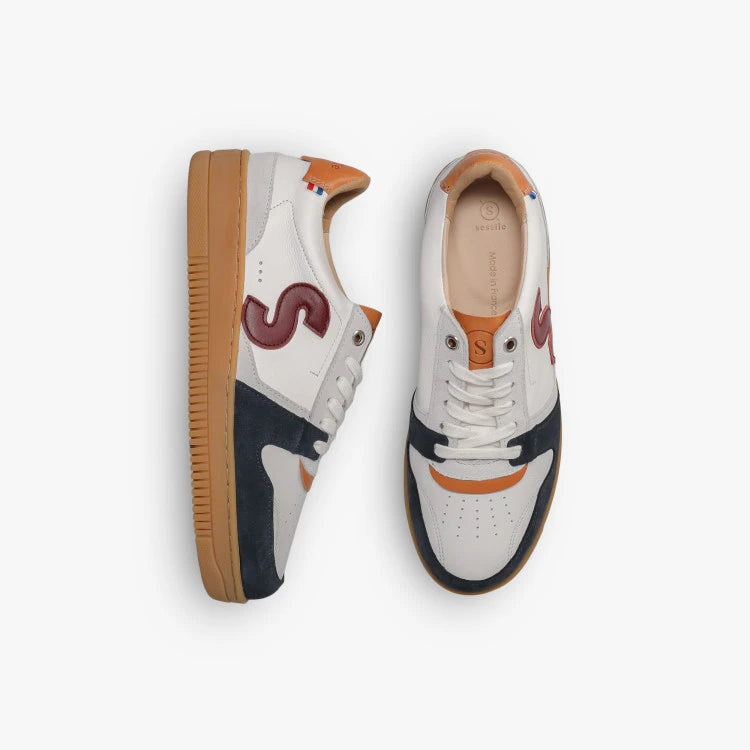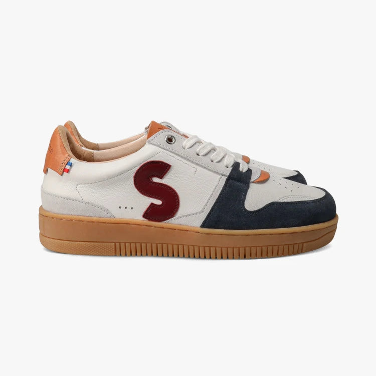 Ce modèle en cuir premium joue sur un contraste subtil entre gris clair et blanc épuré, sublimé par des détails camel et un S noir distinctif. Une basket énergique et intemporelle, parfaitement adaptée au rythme effréné de la ville.